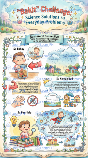 Gagawa tayo ng "Bakit?" listahan ng mga mystery sa araw-araw (hal. Bakit natutuyo ang damit sa ilalim ng araw? Bakit lumulutang ang bangka?). Gagamitin ang Science lessons para sagutin ang mga tanong at i-connect ang natutunan sa totoong buhay.