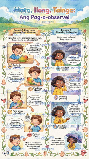 Ang pinakaunang skill ng scientist ay ang Pag-o-observe. Aalamin natin kung paano gumagana ang ating five senses—paningin (sight), pandinig (hearing), pang-amoy (smell), panlasa (taste), at pandama (touch)—para makakuha ng data. Magkakaroon ng interactive activity kung saan gagamitin ang senses para i-describe ang mga mystery objects.