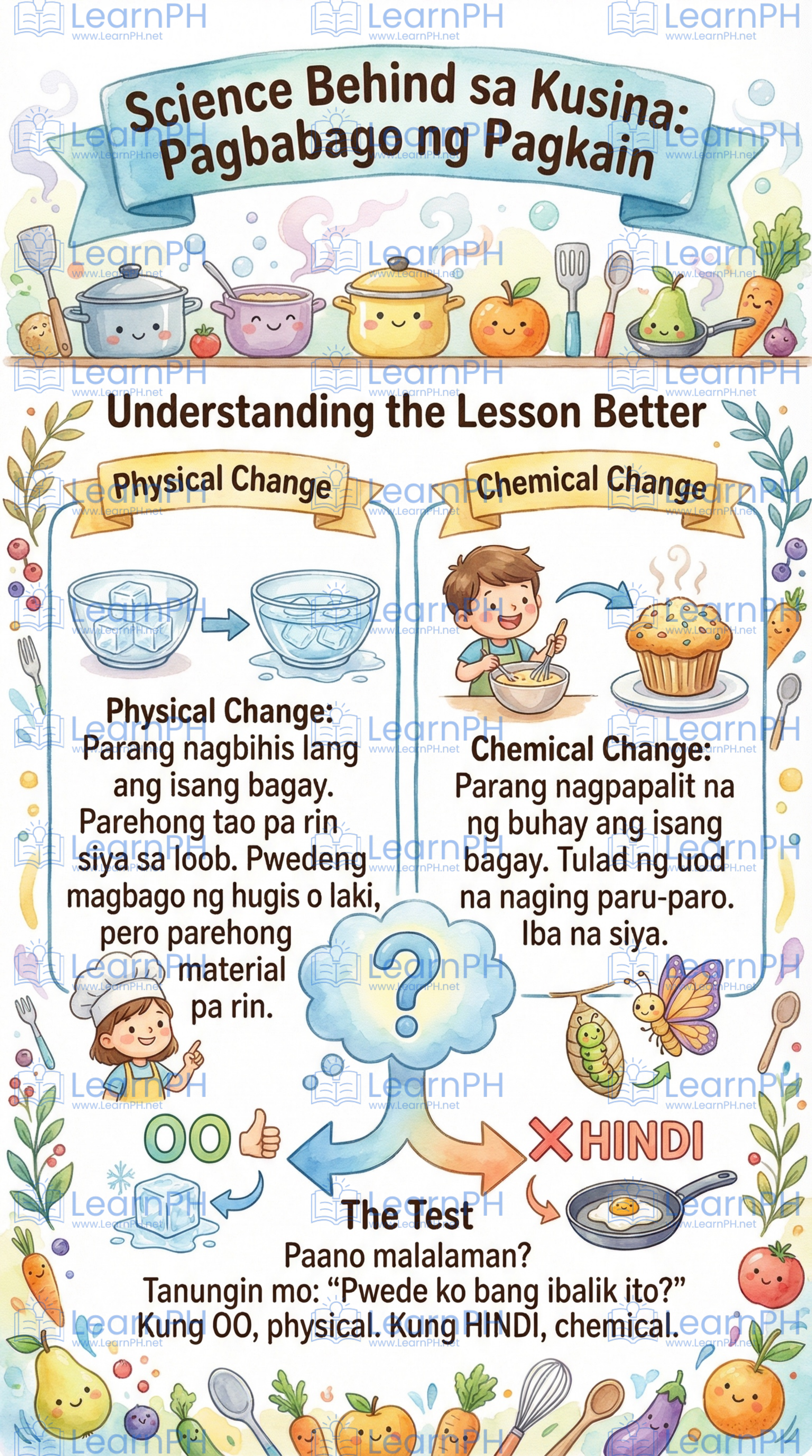 Ang eBook na ito ay naglalayon na matukoy ang mga simple physical (tulad ng pagtunaw) at chemical (tulad ng pagluto) changes na nangyayari sa paghahanda ng pagkain.